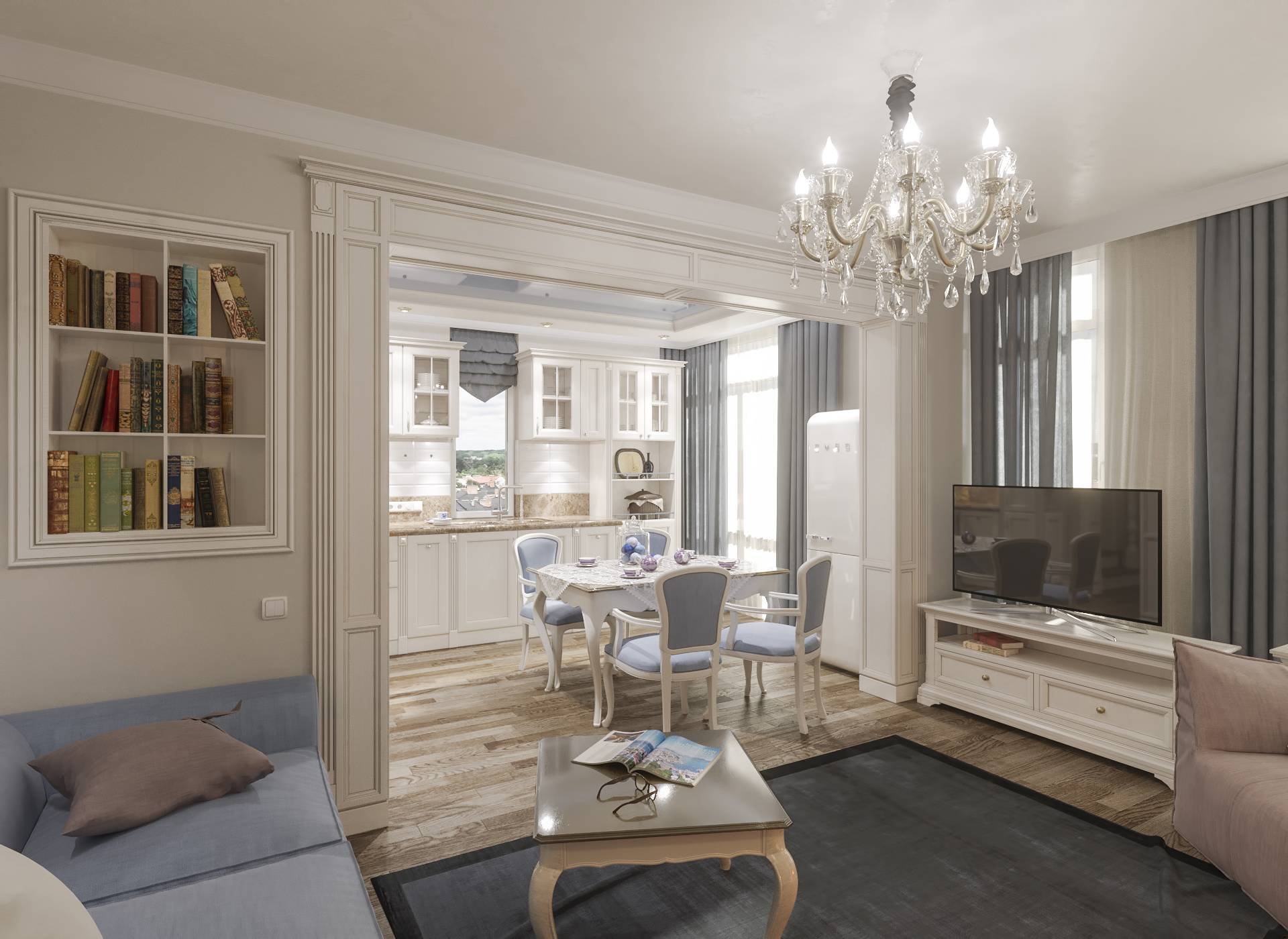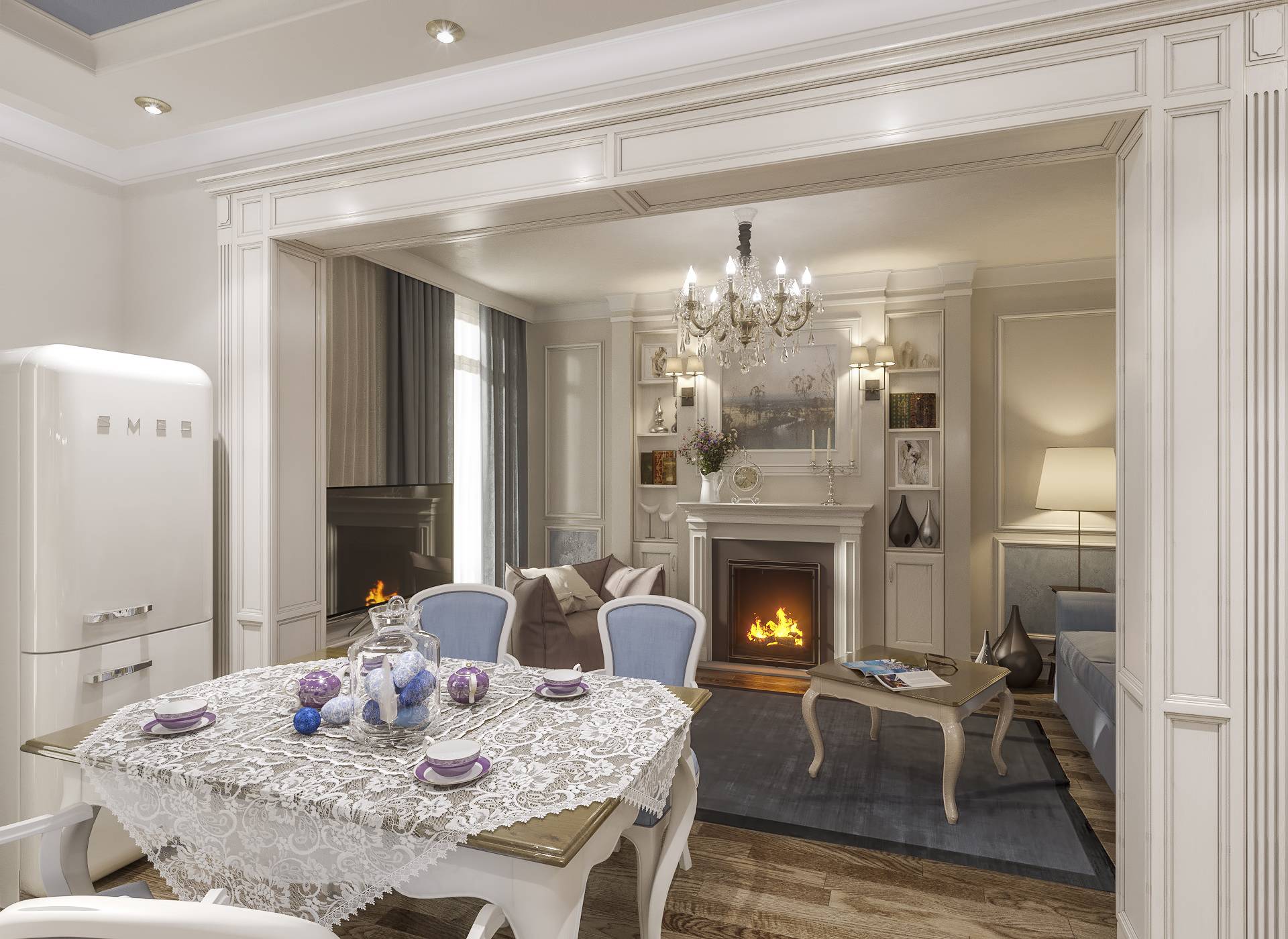 Дизайн выполнялся в легком классическом стиле с современными элементами. Многоуровневые потолки обрамлены багетами, используется светодиодная подсветка.